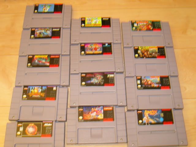 Those are thirteen of my old games. I had more but lost them. Im going to play, and Post My personal Opinion of the games. I think i'll Start with Super Mario World First. Ill keep you in touch.